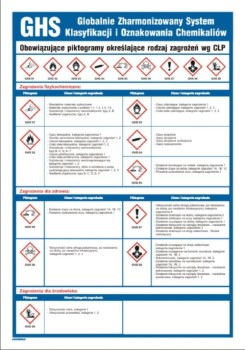 Tablica poglądowa z wykazem i opisem piktogramów oznakowań chemicznych wg CLP